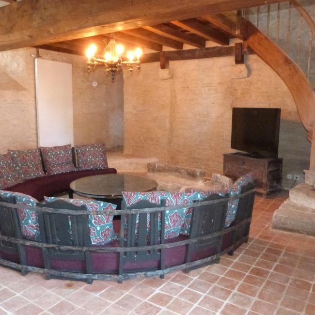 Au 1er étage, une pièce de 25 m2 est équipée d’un coin cuisine, d’une salle de bains aménagée dans l’ancienne tourelle de latrines. Il y a aussi un espace extérieur confortable sur le palier du vieil escalier droit à l’avant du bâtiment.